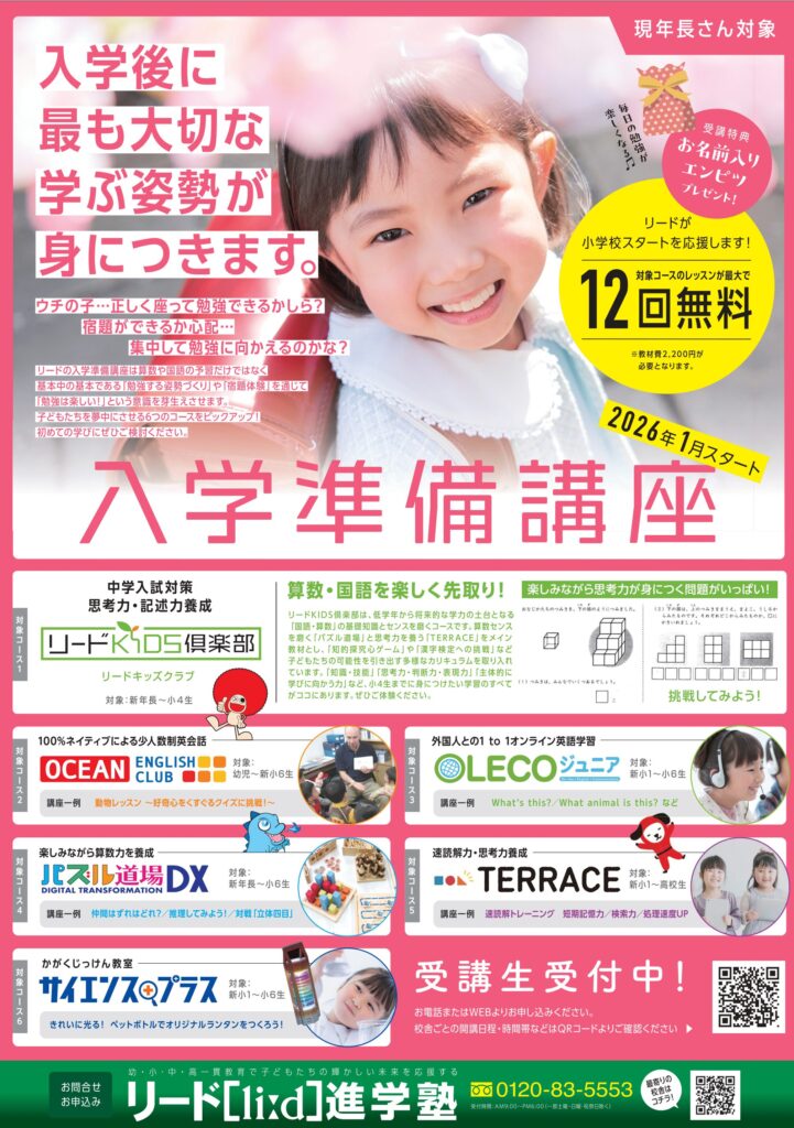 リード進学塾は、来年の春から新たに小学校へ入学するお子様向けに、応援する講座を準備しています。