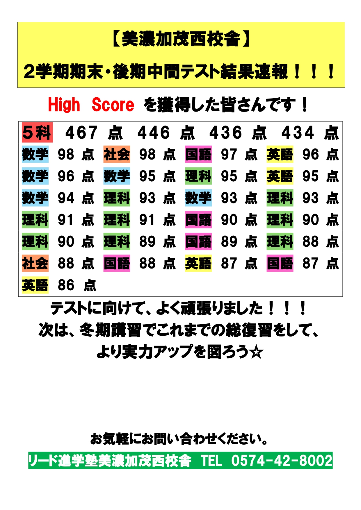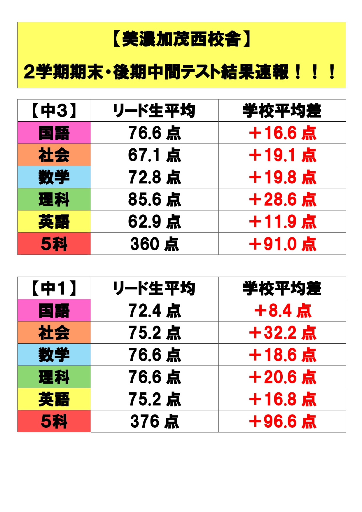 美濃加茂西校舎 テスト結果速報です!