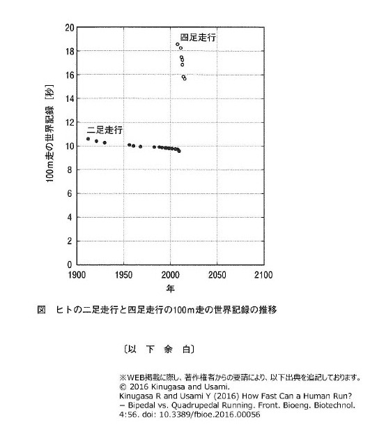 グラフを見ると、二足走行の世界記録はほとんど変化がないのに対し、四足走行の世界記録はどんどん短縮されています。このままいくと将来、二本の線がどこかで交差しそうです。