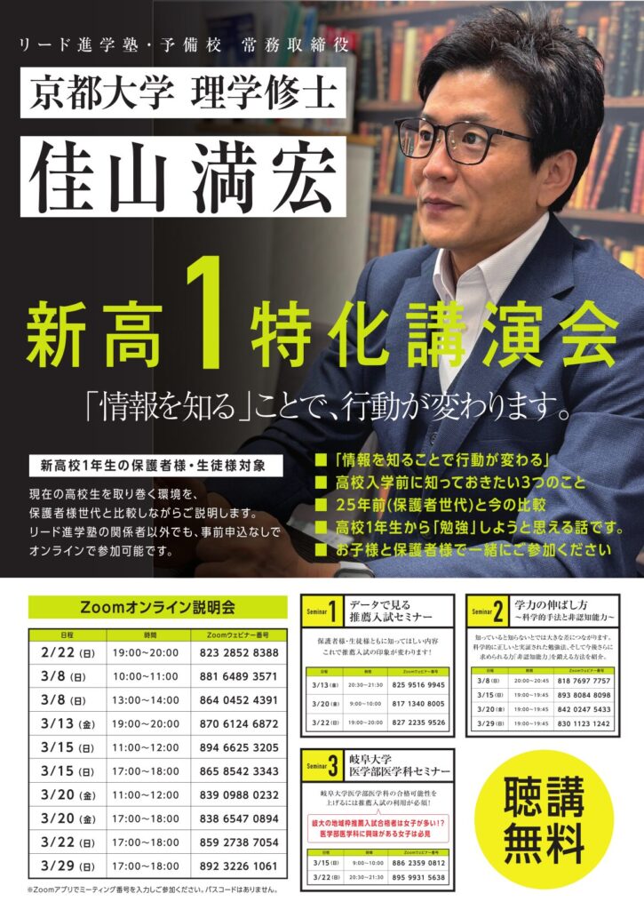 ぜひご参加ください。そして高校1年生から学習を本格化させようと塾・予備校を検討されるなら、他塾・他予備校の説明会にも足を運んでみてください。比較していただくことで、リード予備校のこだわりや情報の粒度をご理解いただけるはずです。(オンライン説明会がもっと普及してくれれば、比較もずっと楽になるのですが……ここは業界全体への宿題ですね。)