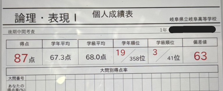 岐阜高校で学年順位が19位というのは、(前回が学年平均よりだいぶ下だったことを考えると(笑))なかなかすごいです!