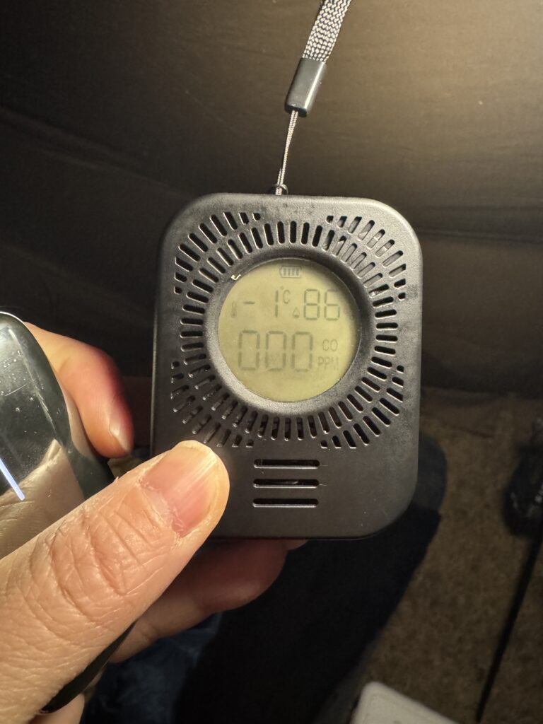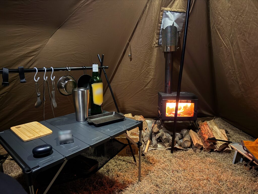 薪ストーブと石油ストーブをつけて、夜の22時くらいでテント内の温度は
