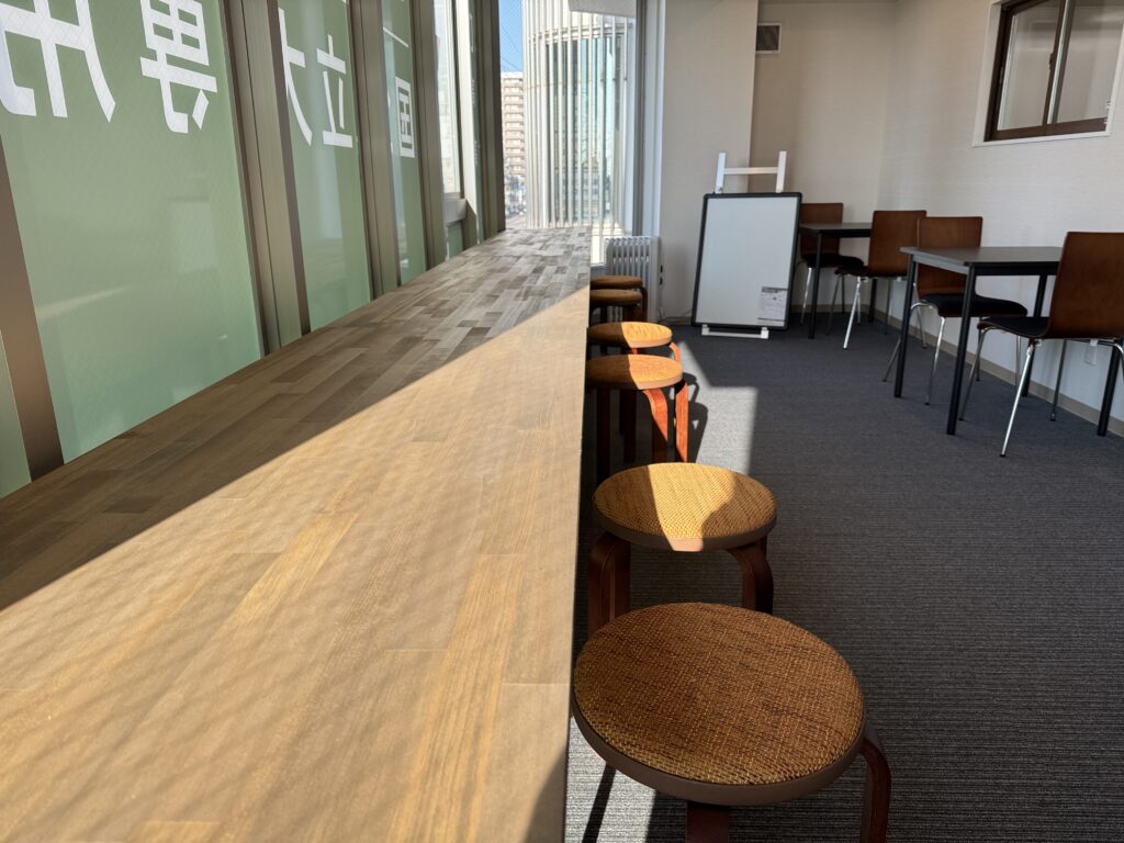 時間帯によって食事休憩スペースと自習スペースになります。