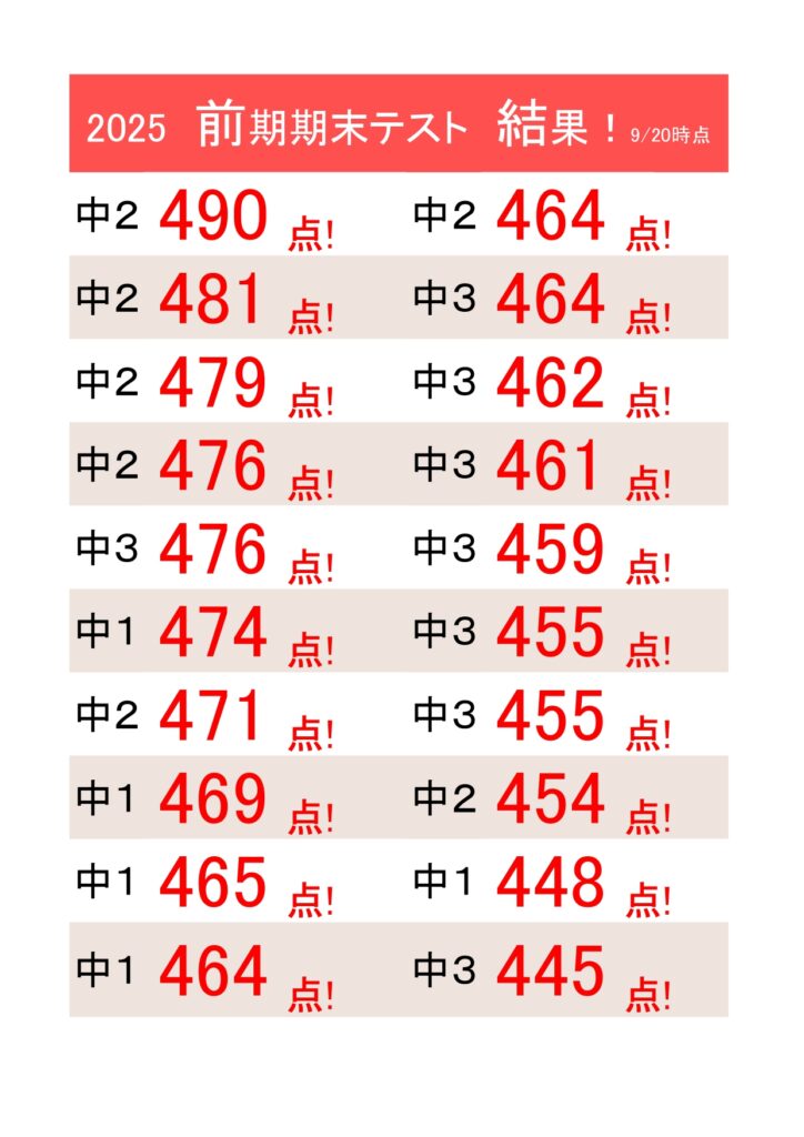 皆さんが夏期講習、定期テスト前に頑張って自習室に来てくださったり、遅くまで残って勉強した成果がでて嬉しく思います!