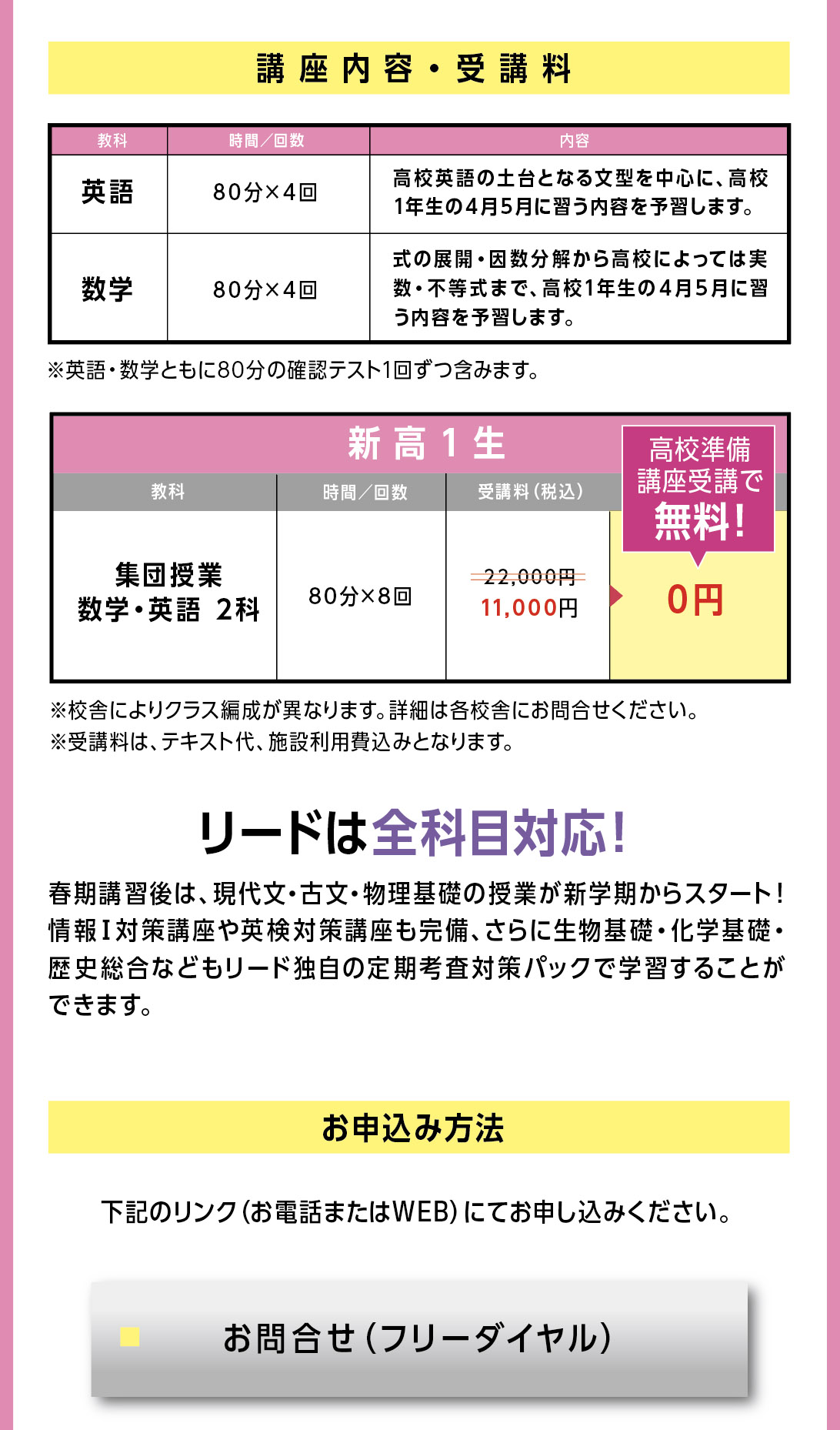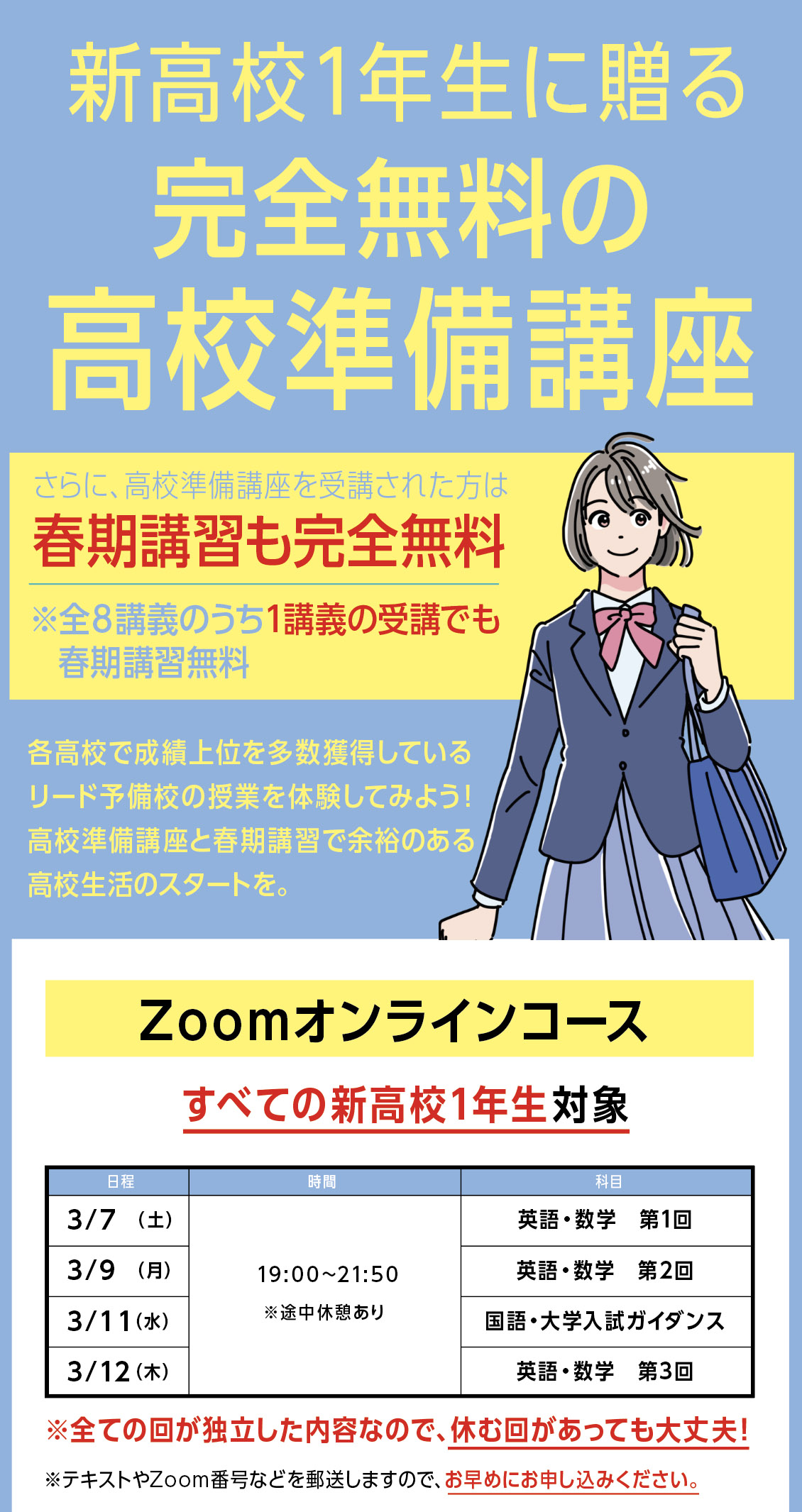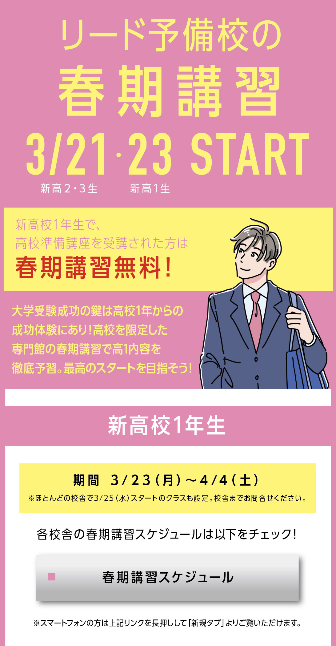 リード進学塾は幼・小・中・高一貫教育で子どもたちの輝かしい未来を応援します。 HOME 幼・小学部 中学部 高等部 合格実績 小中学部ブログ 高等部ブログ 校舎案内 受験情報 最新情報 HOME 幼・小学部 中学部 高等部 合格実績 小中学部ブログ 高等部ブログ 校舎案内 受験情報 HOME > 最新情報 > 高等部 高校準備&春期生受付中 高等部 高校準備&春期生受付中 前へ 次へ 一覧へ 前へ 次へ 一覧へ 詳しく知りたい方はコチラから! リード進学塾/予備校について リード進学塾/予備校 資料請求について リード進学塾/予備校 体験授業について リード進学塾/予備校 お問い合わせについて