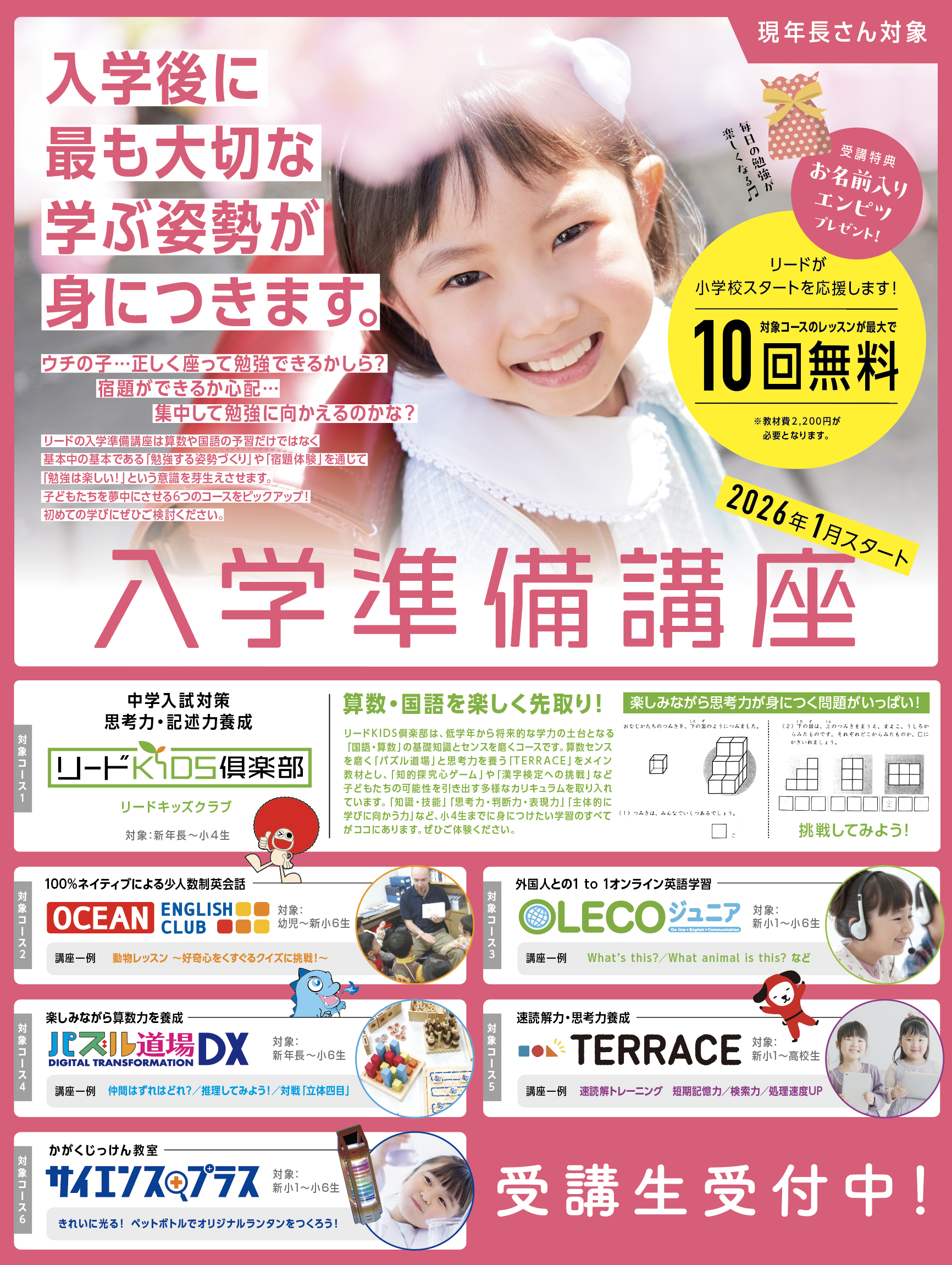 リード進学塾、リード予備校は岐阜県の多治見市・土岐市・瑞浪市・恵那市・中津川市・可児市・ 美濃加茂市・関市・各務原市・岐阜市・羽島市・大垣市、愛知県の江南市・春日井市において校舎を展開。 幼・小・中・高一貫指導で、能力開発から学校のテスト対策、高校受験、大学受験まで幅広い教育サービスを地域密着で行っている学習塾です。 幼児から小学生対象のキッズ向け能力開発コースでは、「楽しみながら身につく習い事を!」という理念のもとネイティブによる英会話教室・算数パズル・思考力育成・読書・速読聴・理科実験教室・ゲームプログラミング・ロボットプログラミング・早期英語4技能習得・そろばん教室など、様々な能力開発プログラムを用意しています。 小・中学部(リード進学塾)では、1教科専任のプロ講師による5教科完全指導を実施。普通の学力のお子さまを鍛えて伸ばし、岐阜5校(岐阜高校・岐阜北高校・加納高校・岐山高校・長良高校)、 各務原西高校・関高校・可児高校・加茂高校・多治見北高校・多治見高校・恵那高校など岐阜県のトップ校や愛知県のトップ校合格を可能にする学力を養成します。東濃地区・可茂地区・美濃地区ではNo.1の合格実績を誇ります。 高等部(リード予備校)では、各高校の「専門館」としてターゲット校を絞ることで無理、無駄のない手厚い指導を行います。高校生の様々なニーズに合わせ、集団指導、個別指導、キャリア教育など多様なコースを設定。高校の定期考査対策・ベネッセ総合学力テスト対策・小論文対策・推薦入試対策・大学入学共通テスト対策など生徒に最適な指導を行い、東京大学・京都大学・名古屋大学などの難関国公立大学・私立大学へ現役合格が可能な学力を養成します。大学受験のプロによる的確な進路指導、親身なカウンセリングの他、無料で利用できる自習室などサポート環境も充実しています。また河合塾マナビスやウイングネットも導入し、大学入学共通テストにも完全対応したカリキュラムをお届けします。
