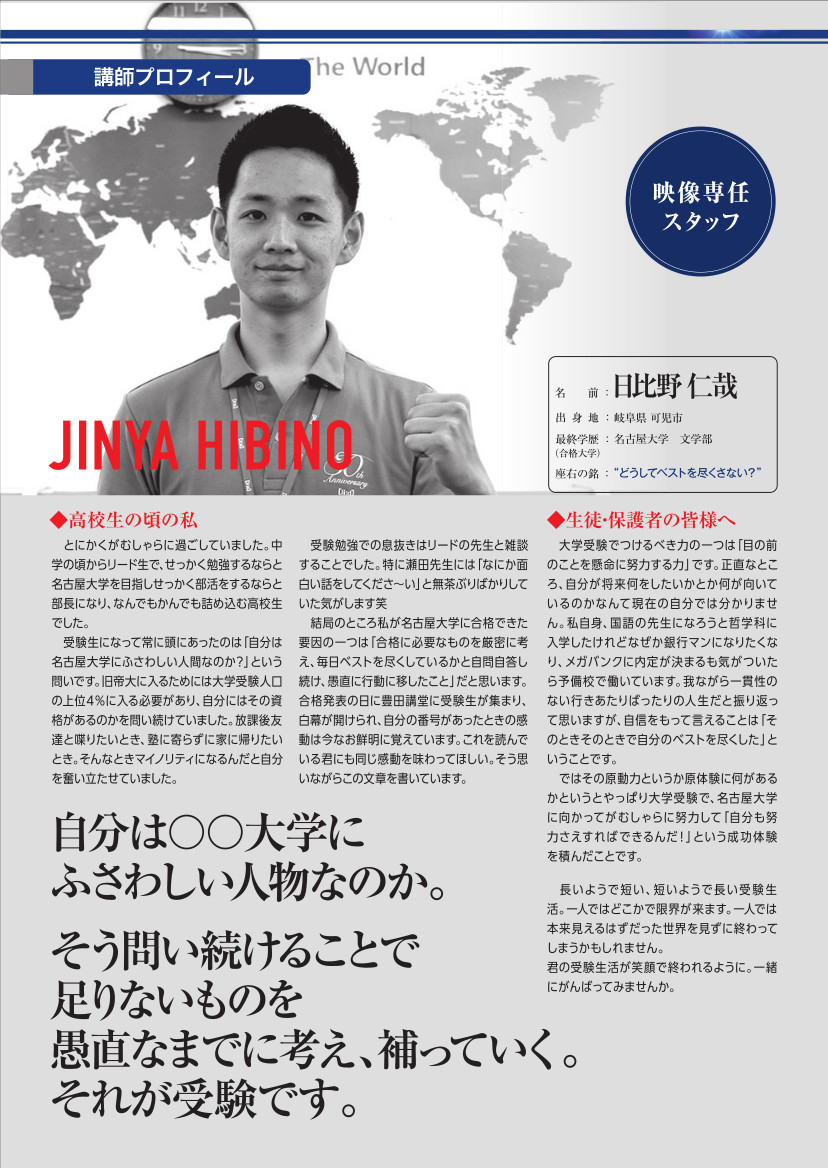 河合塾マナビス 忠節校 校舎名:河合塾マナビス 忠節校 住所:岐阜県岐阜市島栄町1-38 電話番号:058-201-0802 FAX番号: 新年度生徒募集 マナビス忠節校舎の紹介動画 下記の画像をクリック・タップしてください。 【対象高校】 マナビス忠節校舎は、全高校に対応 【無料体験会】 1DAY体験会、随時実施中 お気軽にお問い合わせください。 【マナビス忠節校舎の強み】 熱意あふれ学力の高いスタッフが対応することが1番の強みです。 質問対応から生徒面談まで上記動画のスタッフが対応します。 マナビス忠節校のアドバイザー 岐阜県トップレベル 岐阜高・岐阜北高専門館の講師紹介 佳山講師 京都大学 理学修士 田辺講師 東京大学 経済学部 土屋講師 横浜国立大学 高橋講師 カルガリー大学 TOEIC FULL SCORE 日比野講師 名古屋大学 文学部 マナビス専属スタッフ
