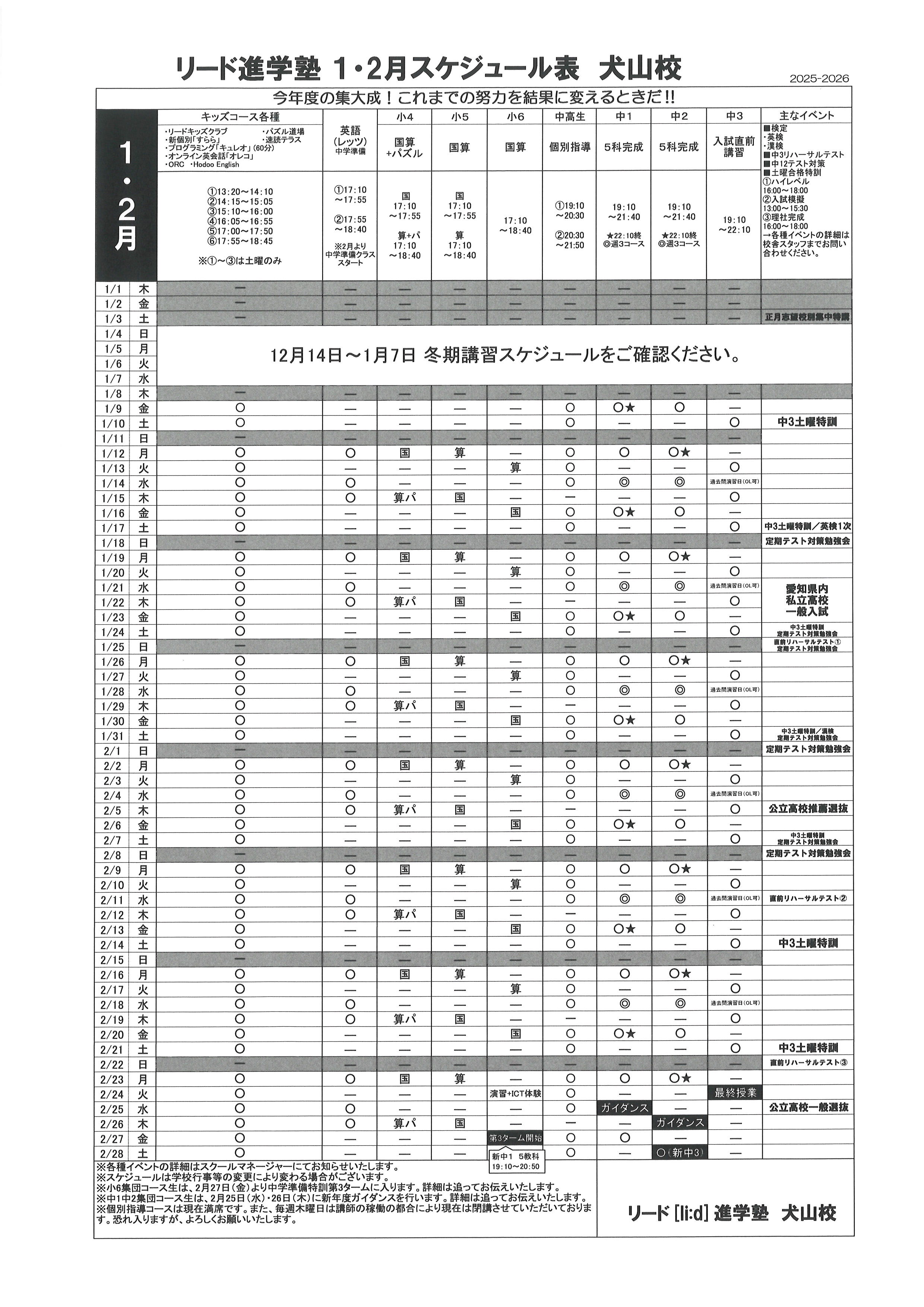 →犬山市内&扶桑町内の各学校の予定を考慮し校舎スケジュールを作成しております。