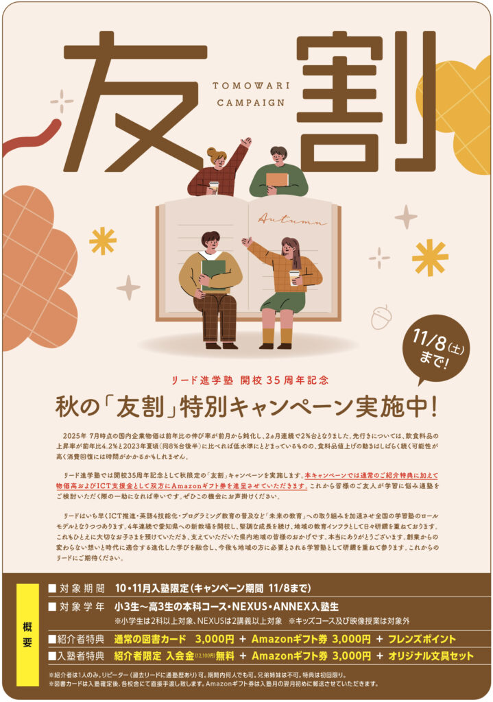 秋の友割キャンペーン実施中!10,11月入塾生募集中。