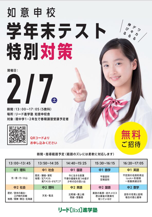 如意申校 校舎名:如意申校 住所:愛知県春日井市稲口町1丁目16-1 電話番号:0120-83-5553 FAX番号: 教室紹介ギャラリー 画像をクリックすると拡大されます 本科コース 学年末テスト対策(無料招待) 2026春期講習(新規開校記念 無料招待) 2026春 新規開校(説明会受付中) 今話題の塾が春日井に開校