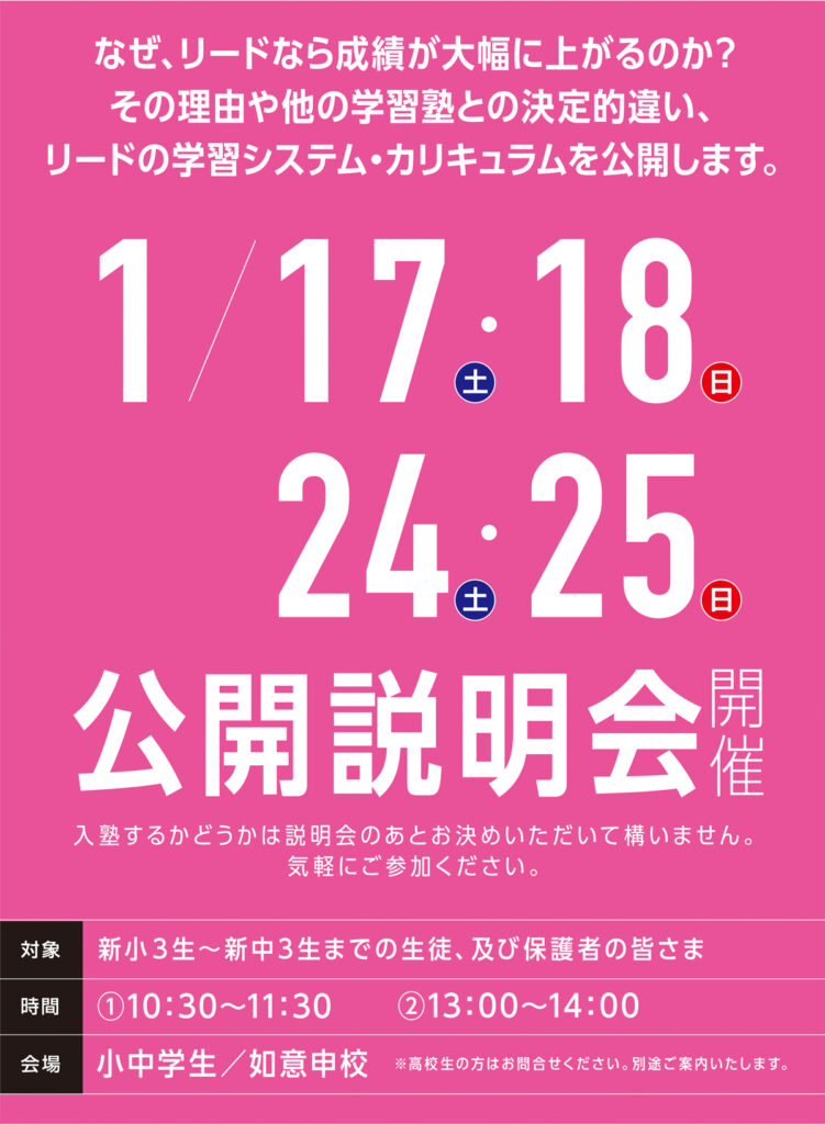 リード進学塾は幼・小・中・高一貫教育で子どもたちの輝かしい未来を応援します。 HOME 幼・小学部 中学部 高等部 合格実績 小中学部ブログ 高等部ブログ 校舎案内 受験情報 如意申校 HOME 幼・小学部 中学部 高等部 合格実績 小中学部ブログ 高等部ブログ 校舎案内 受験情報 HOME > 校舎検索 > 如意申校 如意申校 校舎名:如意申校 住所:愛知県春日井市稲口町1丁目16-1 電話番号:0120-83-5553 FAX番号: 教室紹介ギャラリー 画像をクリックすると拡大されます 本科コース 学年末テスト対策(無料招待) 2026春期講習(新規開校記念 無料招待) 2026春 新規開校(説明会受付中) 今話題の塾が春日井に開校 各校舎ご案内 西濃地方 大垣西校 大垣市荒川町 443-5 詳細について 大垣南校 岐阜県大垣市南頬町4-137-1 詳細について 大垣北校 大垣市中野町5-18 詳細について ANNEX+大垣東校 大垣市和合新町 2-48 詳細について 大垣駅前校(リード予備校) 大垣市林町5-71-5 詳細について 岐阜地方 鵜沼校 各務原市鵜沼西町1-606-3 詳細について 那加校 各務原市那加住吉町3-1 詳細について 各務原校 各務原市蘇原栄町4-18-1 詳細について 岐阜西校 岐阜市鏡島精華2-1-18 詳細について 西郷校 岐阜市中2-92-2 詳細について 岐阜東校 岐阜市細畑6-3-16 詳細について 岐阜本校 岐阜市東金宝町1-4-2 詳細について 芥見校 岐阜市芥見長山3-2 詳細について 長良校 岐阜市福田町1-30 詳細について 三田洞校 岐阜市粟野東5-76-1 詳細について 柳津校 岐阜市柳津町蓮池5-25 詳細について 羽島校 羽島市竹鼻町狐穴392-1 詳細について 則武校 岐阜市則武中2-6-5 詳細について 穂積校 瑞穂市別府739-1 詳細について 北方校 本巣郡北方町加茂1-2 詳細について ANNEX+金華橋通り校 岐阜市御杉町10-1 詳細について ANNEX加納校 岐阜市加納朝日町3-5-1 詳細について ANNEX 長森校 岐阜市野一色7-11-7 詳細について ANNEX+正木校 岐阜市正木中3-6-1 詳細について 各務原校(リード予備校) 各務原市蘇原栄町4-18-1 詳細について 忠節校(リード予備校) 岐阜市島栄町2-11-1 詳細について 長良校(リード予備校) 岐阜市長良福光1640-1 詳細について 加納校(リード予備校) 岐阜市加納朝日町3-5-1 詳細について 河合塾マナビス 忠節校 岐阜県岐阜市島栄町1-38 詳細について 河合塾マナビス 長良校 岐阜県岐阜市長良福光1640-1 詳細について 河合塾マナビス 各務原校 各務原市蘇原栄町4-18-1 詳細について 中濃地方 広見校 可児市広見1559-1 詳細について 可児校 可児市下恵土2930-3-4 詳細について 西可児校 可児市帷子新町1-24 詳細について 美濃加茂西校 美濃加茂市太田町178-1 詳細について 美濃加茂東校 美濃加茂市森山町1-5-17 詳細について 関弥生校 関市弥生町3-54-5 詳細について 関山王通校 関市緑ヶ丘2-5-31 詳細について 美濃校 美濃市松森410-3 詳細について 関校(リード予備校) 関市弥生町3-54-5 詳細について 可児校(リード予備校) 可児市広見1559-1 詳細について 河合塾マナビス 関校 関市弥生町3-54-5 詳細について 東濃地方 音羽校 多治見市音羽町2-27 詳細について 京町校 多治見市京町1-157 詳細について 希望ヶ丘校 多治見市小名田町西ヶ洞1-63 詳細について 土岐校 土岐市泉町久尻44-19 詳細について 瑞浪校 瑞浪市穂並3丁目39 詳細について 恵那校 恵那市大井町208-4 詳細について 中津川校 中津川市太田町2-4-5 詳細について 音羽校(リード予備校) 多治見市音羽町2-27 詳細について 多治見校(リード予備校) 多治見市音羽町2-28 詳細について 恵那校(リード予備校) 恵那市大井町206-3 詳細について 愛知県 江南古知野校 愛知県江南市江森町中88 詳細について 如意申校 愛知県春日井市稲口町1丁目16-1 詳細について 高蔵寺校 春日井市高蔵寺町北4-2-19 詳細について 新守山校 名古屋市守山区鳥神町98番地 詳細について 犬山校 犬山市上野石塚388-5 D棟 詳細について 江南中央校 江南市赤童子町良原28番地3 詳細について 江南校(リード予備校) 江南市赤童子町良原28番地3 詳細について 春日井校(リード予備校) 愛知県春日井市鳥居松町4丁目176 詳細について 詳しく知りたい方はコチラから! リード進学塾/予備校について リード進学塾/予備校 資料請求について リード進学塾/予備校 体験授業について リード進学塾/予備校 お問い合わせについて