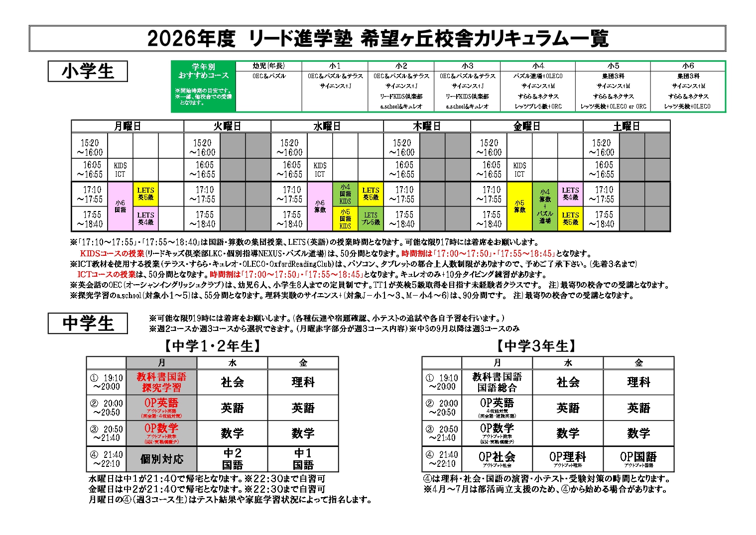 ※希望ヶ丘校の教科・日時は下記の通りです。