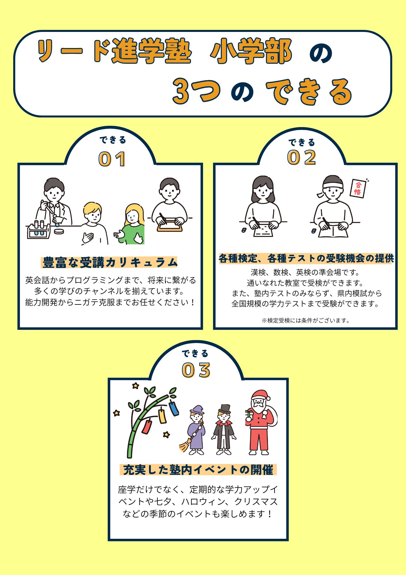 ✐科目 国語・算数・英語 ✐曜日 金曜日(国語) 火曜日(算数) ✐時間 17:10~18:40 ※英語はお子様に合わせた曜日・クラスをご案内いたしますので校舎にお問い合わせください