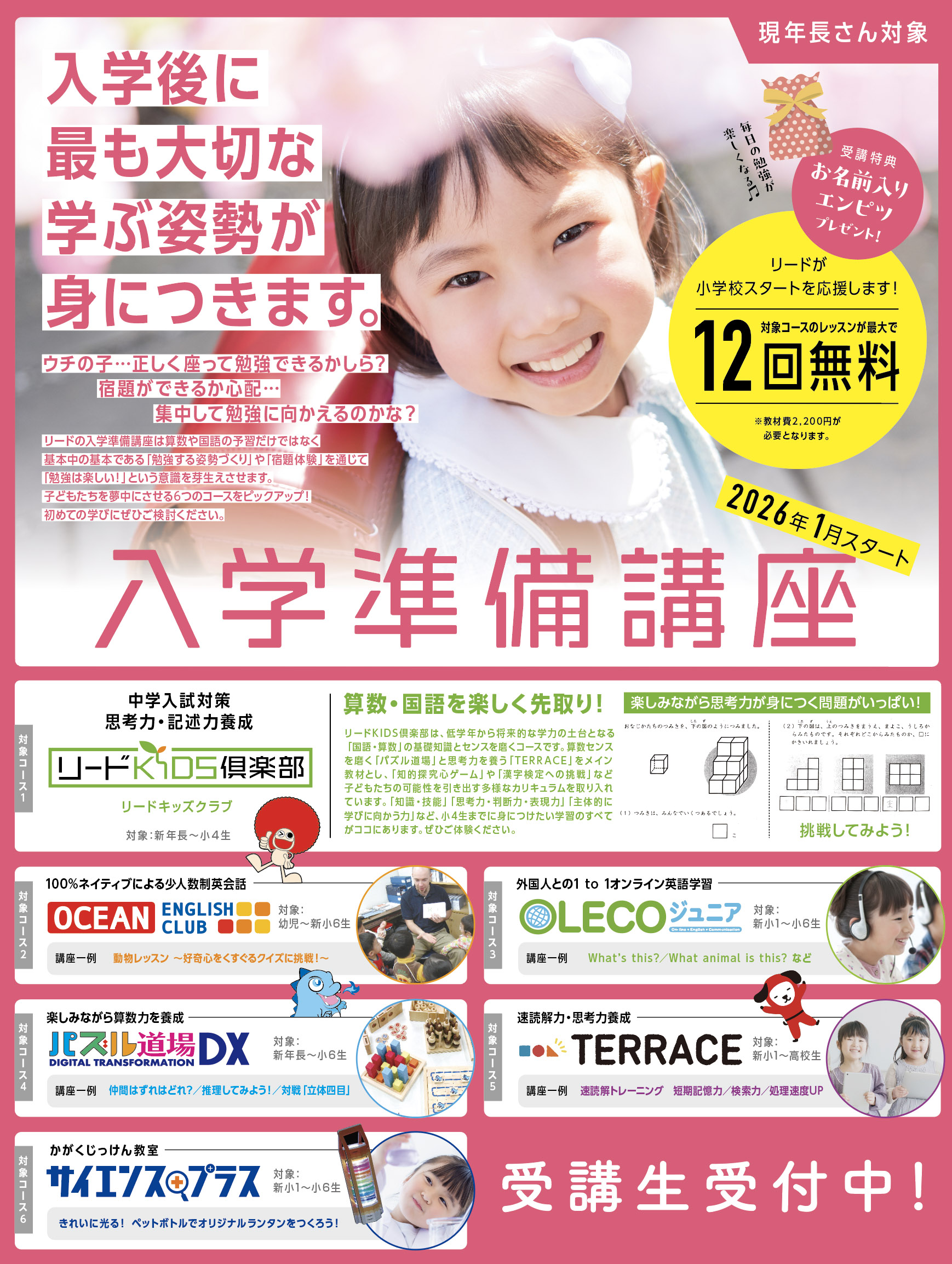 キッズコース体験受付中♪♪ コース詳細は以下よりご確認いただけます。 ■ アウトプット型探究学習『a.school』 ■ 速読解力・思考力養成『TERRACE』 ■ 新個別指導アクティブクラス『すらら』 ■ 中学入試対策『リード KIDS倶楽部』 ■ ネイティブによる英会話『オーシャン』 ■ 1 to 1英語学習『OLECO』 ■ 英検取得・英文法『LETS』 ■ ゲームプログラミング『QUREO』 ■ 算数力養成『パズル道場』 きっとお子様にあったコースが見つかります! 体験を随時受け付けております!