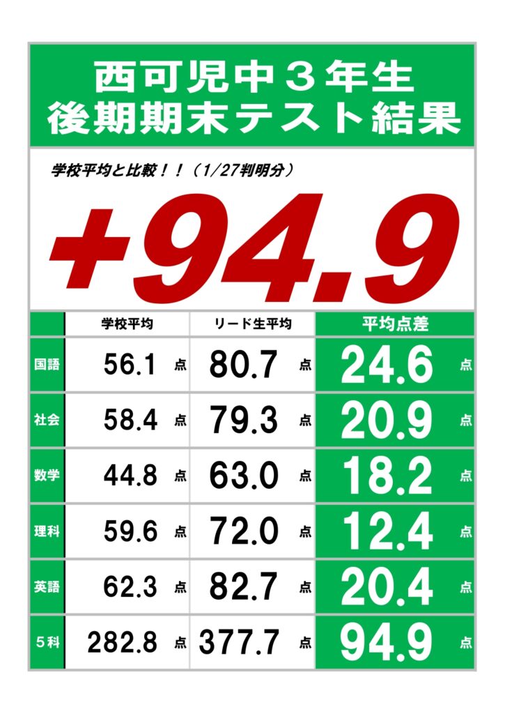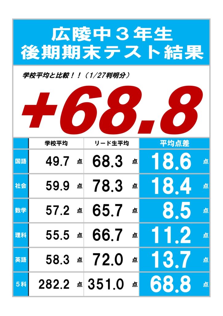 広陵中学校3年生 後期期末テスト結果!