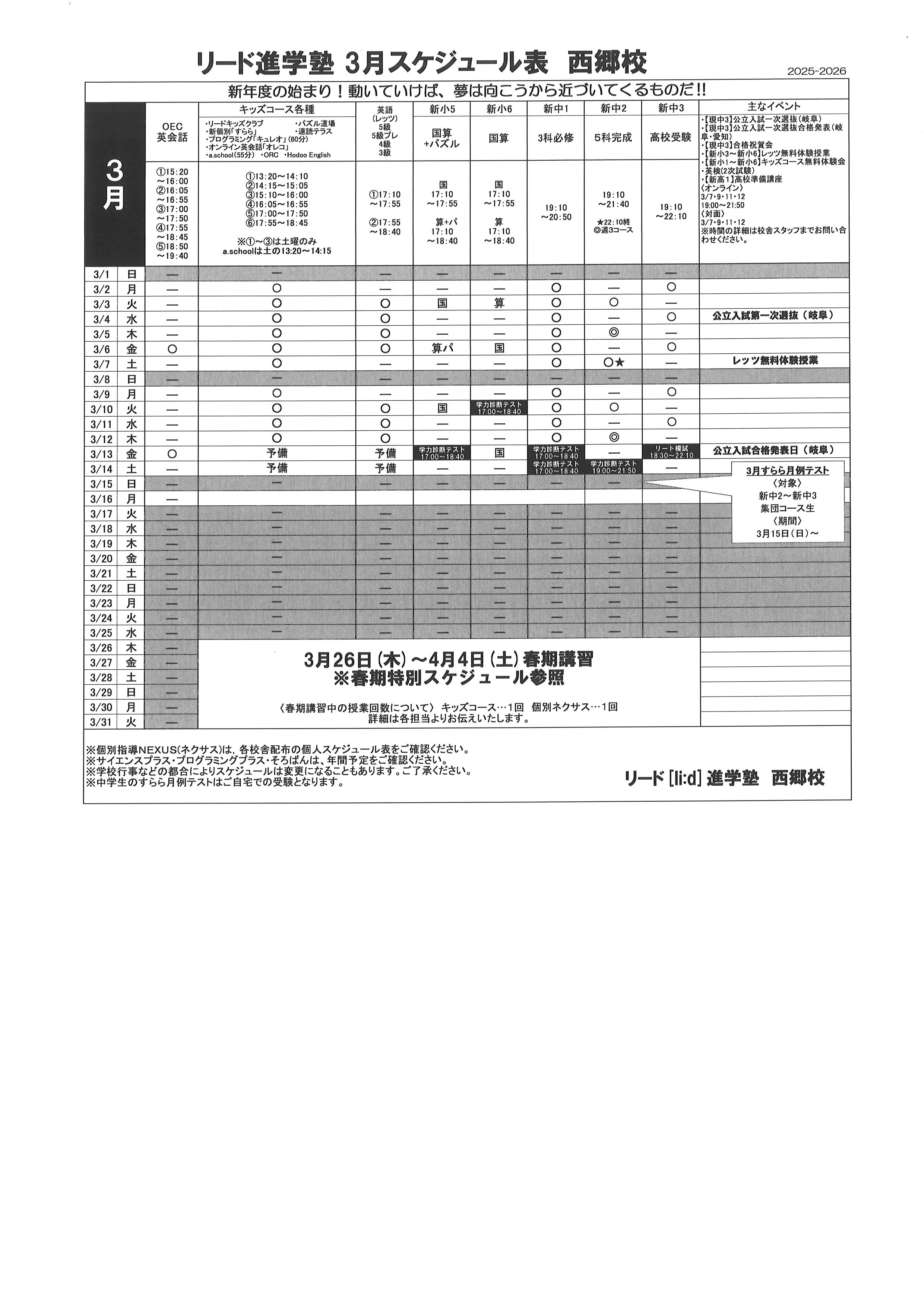 西郷校の春期講習スケジュールの確認ができます。 HP上段のギャラリーよりご確認いただけます。