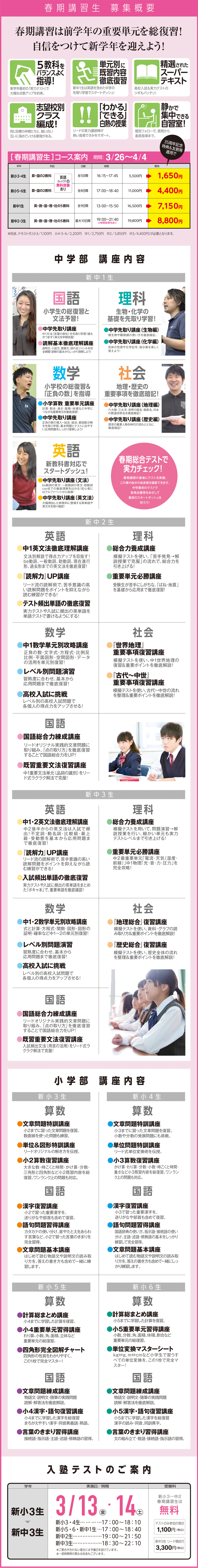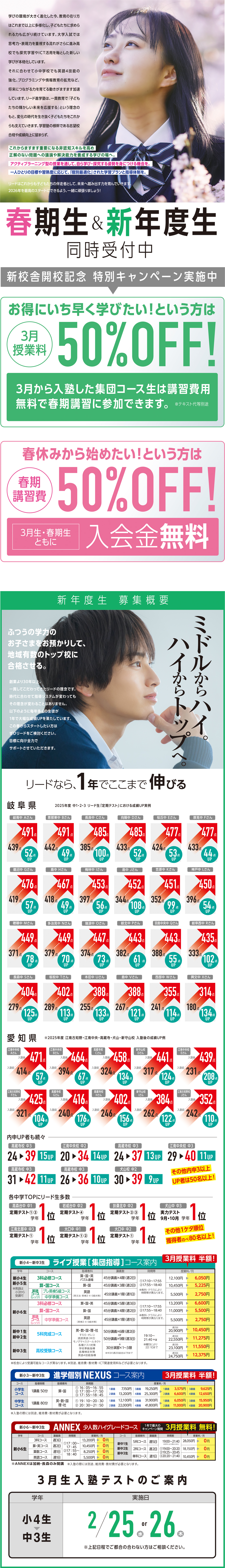 リード進学塾は幼・小・中・高一貫教育で子どもたちの輝かしい未来を応援します。 HOME 幼・小学部 中学部 高等部 合格実績 小中学部ブログ 高等部ブログ 校舎案内 受験情報 春期生&新年度生同時受付中 HOME 幼・小学部 中学部 高等部 合格実績 小中学部ブログ 高等部ブログ 校舎案内 受験情報 HOME > 春期生&新年度生同時受付中 入塾説明会、入塾テストのお申し込みはこちらから 入塾説明会日程※校舎により異なります。 2月 7日(土) 10:30~11:30 2月14日(土) 10:30~11:30 2月21日(土) 10:30~11:30 2月28日(土) 10:30~11:30 3月 7日(土) 10:30~11:30 ※各校舎別の説明会・テスト日程は以下よりご確認いただけます。 校舎を選択して下さい 【如意申校】 愛知県春日井市稲口町1丁目16-1 【江南中央校】 愛知県江南市赤童子町良原28-3 【音羽校】 多治見市音羽町2-27 【京町校】 多治見市京町1-157 【希望ヶ丘校】 多治見市小名田町西ヶ洞1-63 【土岐駅前校】 土岐市泉町久尻579 【瑞浪校】 瑞浪市穂並3-39 【恵那校】 恵那市大井町208-4 【中津川校】 中津川市太田町2-4-5 【広見校】 可児市広見1559-1 【可児校】 可児市下恵土2930-3-4 【西可児校】 可児市帷子新町1-24 【美濃加茂西校】 美濃加茂市太田町178-1 【美濃加茂東校】 美濃加茂市森山町1-5-17 【関弥生校】 関市弥生町3-54-5 【関山王通校】 関市緑ヶ丘2-5-31 【美濃校】 美濃市松森410-3 【鵜沼校】 各務原市鵜沼西町1-606-3 【各務原校】 各務原市蘇原栄町4-18-1 【那加校】 各務原市那加住吉町3-1 【岐阜本校】 岐阜市東金宝町1丁目4-2 【岐阜西校】 岐阜市鏡島精華2丁目1-18 【岐阜東校】 岐阜市細畑6-3-16 【芥見校】 岐阜市芥見長山3丁目2 【長良校】 岐阜市福田町1-30 【西郷校】 岐阜市中2-92-2 【三田洞校】 岐阜市粟野東5-76-1 【柳津校】 岐阜市柳津町蓮池5-25 【羽島校】 羽島市竹鼻町狐穴392-1 【則武校】 岐阜市則武中2-6-5 【穂積校】 瑞穂市別府739-1 【北方校】 本巣郡北方町加茂1-2 【大垣西校】 大垣市荒川町 443-5 【大垣南校】 岐阜県大垣市南頬町4-137-1 【大垣北校】 大垣市中野町5-18 【高蔵寺校】 愛知県春日井市高蔵寺町北4-2-19 【江南古知野校】 愛知県江南市江森町中88 【犬山校】 愛知県犬山市上野石塚388-5 D棟 【新守山校】 愛知県名古屋市守山区鳥神町98番地 【ANNEX金華橋通り校】 岐阜市御杉町10-1 【ANNEX加納校】 岐阜市加納朝日町3-5-1 【ANNEX長森校】 岐阜市野一色7-11-7 【ANNEX正木校】 岐阜市正木中3-6-1 【ANNEX大垣東校】 大垣市和合新町 2-48