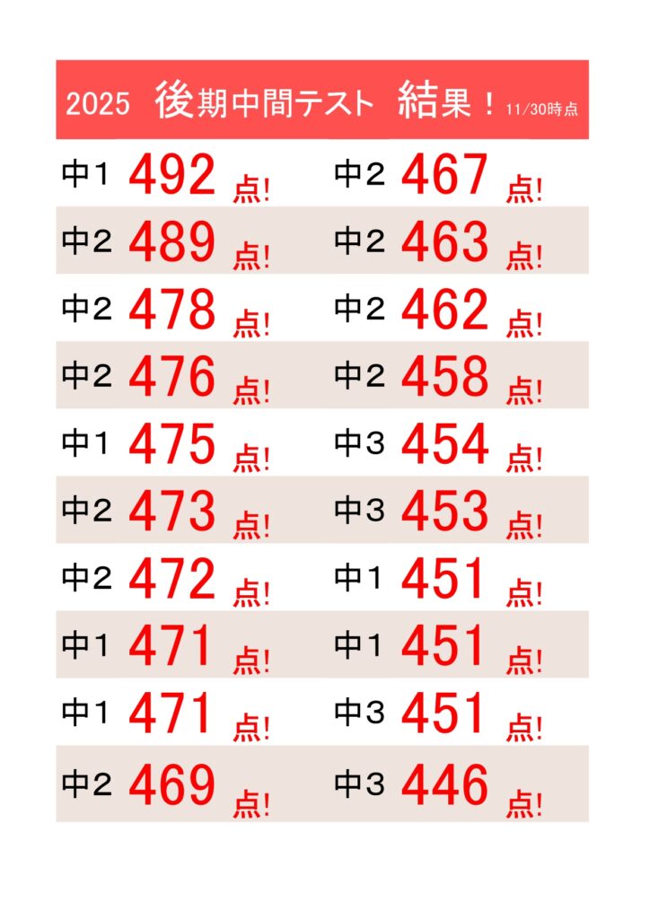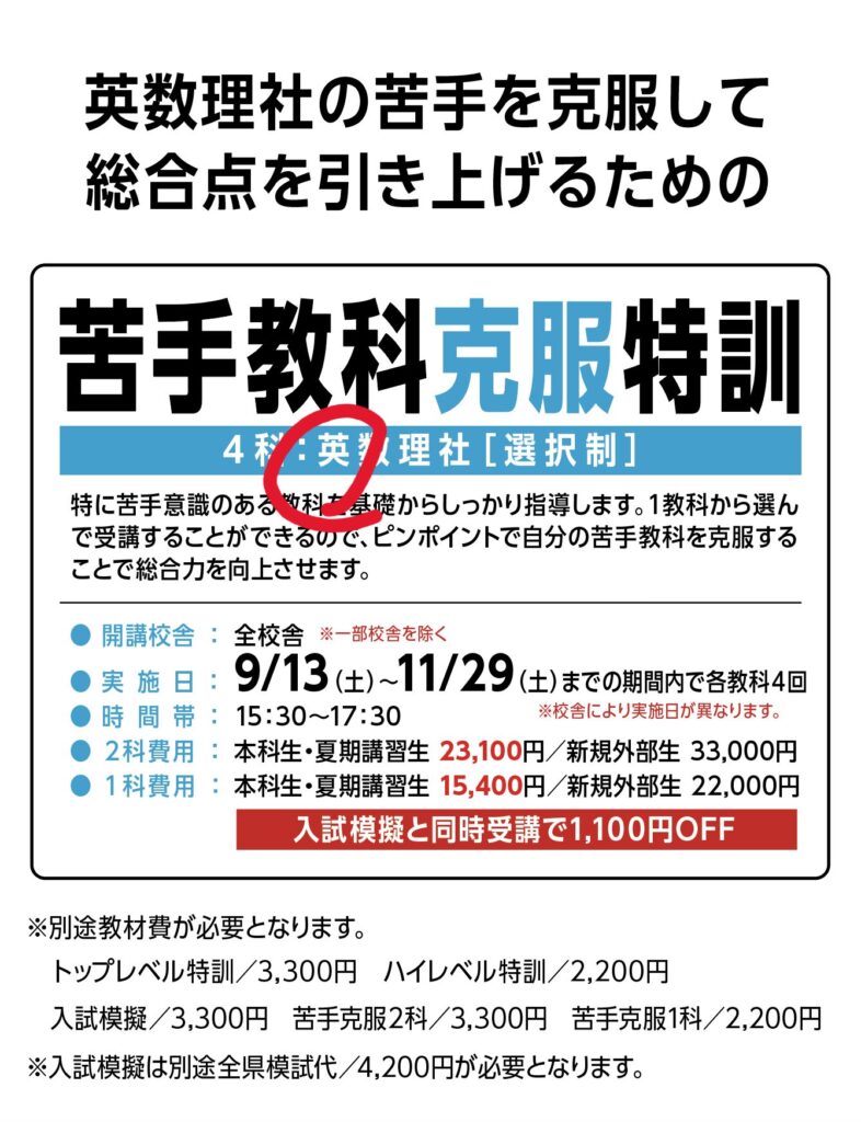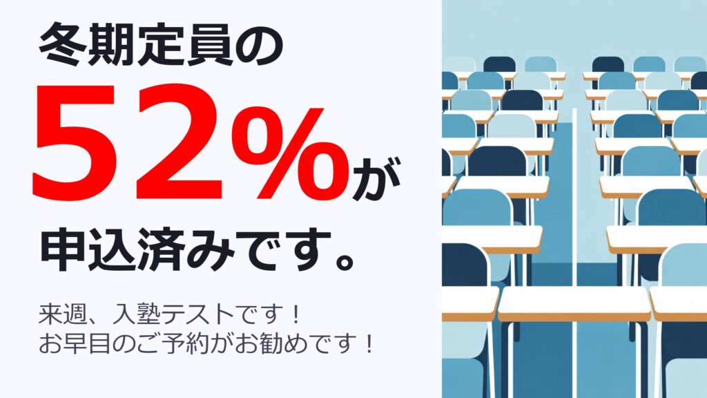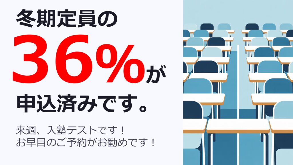 また、中学2年生の冬期講習は、残席が今日現在でわずか2席となっております。ご検討中の方はお早めにご連絡ください。